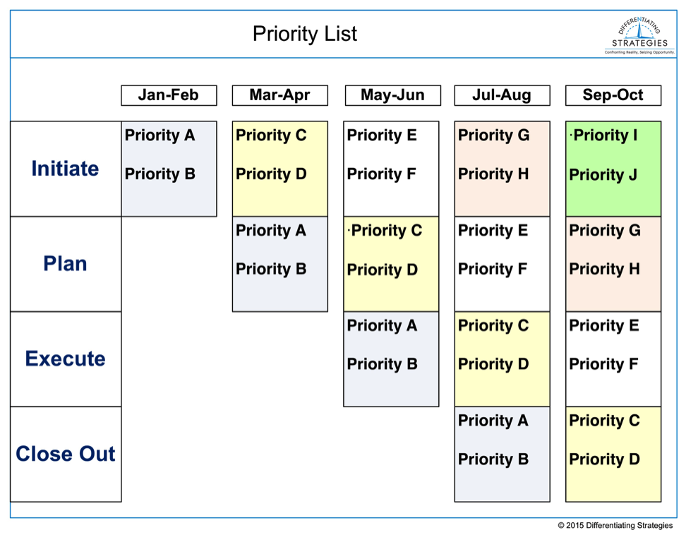 One approach to simplifying prioritizing is to add some dimensions. First consider that deliverables go through a series of stages in their execution. Efforts are initiated, planned, executed and closed out. So one dimension is what stage of execution the item is in. Resources like the Project Management Institute’s Project Management Body of Knowledge (PMBOK) can help define that structure. Then also consider time as a dimension.